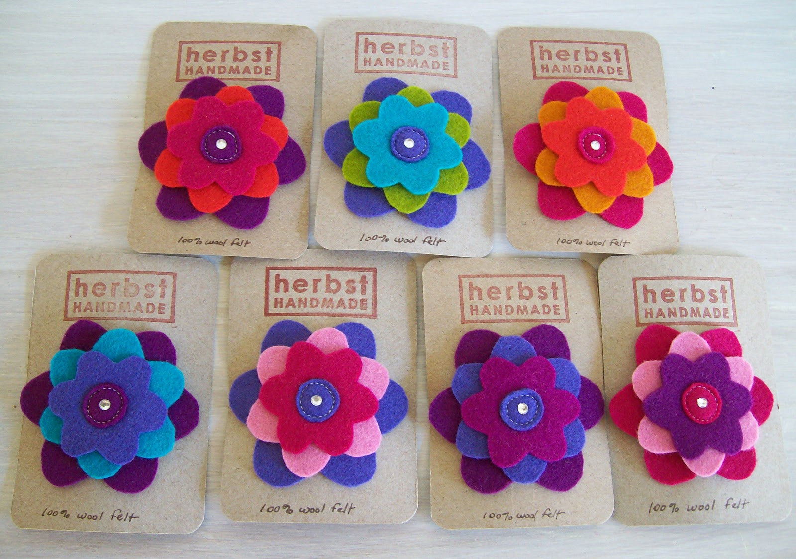 A sampling of 100% wool felt girly hair clippies (I have a couple of these made up as brooches too).